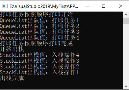 运行结果显示,队列是先进先出操作,栈是先进后出操作,并且操作完成后,数据被删除,如图所示: