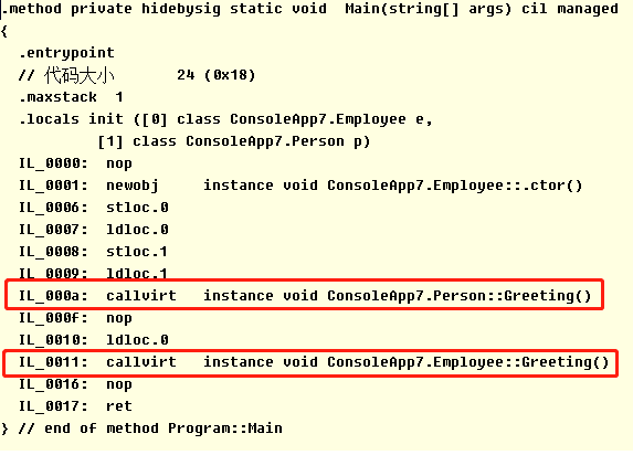 证明了这里确实是用的Callvirt,而这个方法是非虚的方法,所以在两次调用中,引用变量类型Person和Employee就能够决定所调用的方法。两个类分别实现了自己的Greeting方法,没有出现子类覆盖基类方法的情况。这就解释了为什么两次调用结果不同。最后让我们来看看最复杂的一种情况