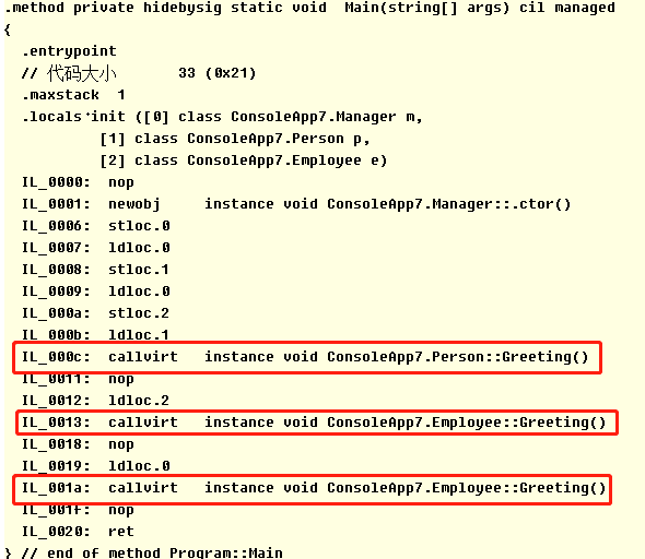 首先,三次调用均是callvirt,而且方法Greeting是虚方法,我们需要考虑对象实例以决定要调用的方法。