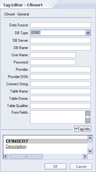 图标,将执行cfinsert这个标签的设定功能。点击后的窗口如下所示: