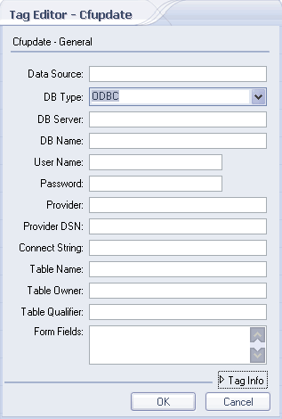 各位可能看到cfupdate的窗口设置和cfinsert的很类似,是的,这两个Tag都是对于Form表单进行专属操作的标签。对于cfupdate的使用方法,作者这里不想多费笔墨,它的使用和cfinsert几乎是一样的,同样,我们用一段程序来看看cfupdate的作用。