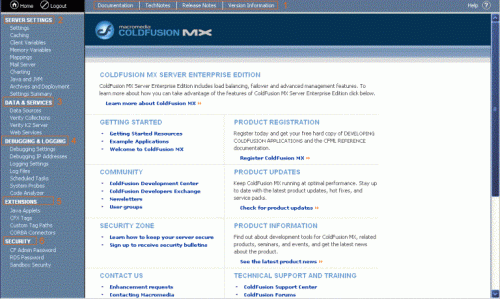 以上四个链接点击后,会在管理界面的主体部分看到基于cfmx的不同的信息。Documentation主要是文档,英文pdf,但是非常有用,从安装到开发,非常齐全,这里就不在赘述。只是要提醒大家一点,cfmx有一些tag和coldfusion5有了很大的区别,在使用的时候多多查阅手册就可以了。以后的内容中,也会随着tag的讲解说到这些。TechNotes则是访问Macromedia官方网站的知识库,如果你的操作系统是中文的,那么会打开基于cfmx关于中文部分的一些Technotes,但是你不要抱太大的希望,目前打开的中文technotes页面还是空的。Release Notes点击后会看到Marcomedia目前发布了哪些关于coldfusionMX的资源和文档,如果中文的操作系统,请直接访问http://www.macromedia.com/go/prod_releasenotes获取相关信息。Version Information则是查看安装在自己系统之上的ColdFusionMX的配置。标明安装在机器上的版本是开发者版本还是专业版、企业版。
