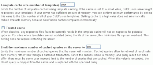 Template cache size (number of templates) n表示用于模版缓存的内存数量,默认是1024,建议在各位做WebSite时不要过分提高这里的数值,也不要设置为0,实际的数值参照站点的被访问情况来定;Trusted cache选中后为不检查cache中的页面是否进行过更新,相比大家都不会勾选了吧,当然,如果你的website百十天也不更新一回,建议还是勾上这个选项,会加速web页面的显示;Limit the maximum number of cached queries on the server to n表示CFMX端存储的查询数量,默认是100个。这会加快同一查询反复工作的速度。