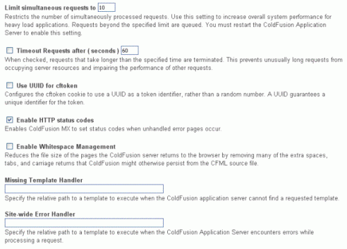 Limit simultaneous requests to n表示配置服务器接受同步请求的数量;Timeout Requests after(seconds) n表示服务器请求超时时间,标准单位为秒,也就是超过一定的时间(秒),服务器会自动中止该请求;Use UUID for cftoken在使用cftoken这个tag时使用UUID这种全局唯一标识方式处理事务,UUID=Universally Unique Identifier;Enable HTTP status codes允许当服务器未处理错误页面时设置状态编码;Enable Whitespace Management允许CFMX服务器启用空格管理,比如压缩不必要的空格和缩进来压缩CFML页面的容量;Missing Template Handler提供了创建和传递通用的.cfm模版的方法,也就是在服务器发现请求索在页面不存在时,给予的一个标准的显示输出;Site-wide Error Handler默认状态下发生错误时,CFMX服务器会显示一个包含错误信息的页面,它与前一点的区别是页面不存在和页面出错的两种相对于浏览者的显示模版可以分别定义。