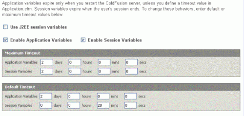 Memory Variables用于管理CFMX中的application和session的有效性,另外,它还可以使用J2EE的Session Variables。如下图: