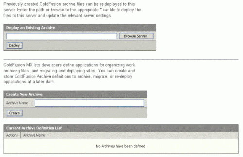 Archives and Deployment则是涉及到了高端的应用,比如配置用户自己的文件,交由服务器管理,那么可以管理的文件以.car的方式存储在机器中,通过browse server来导入,那么可供管理的文档中包含哪些信息呢?包括:文件名和路径,数据源设定,Verity全文检索索引等等。管理界面如下图: