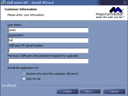 第二步,在下面出现的窗口中填入用户名,密码,ColdFusion MX的序列号,不同的序列号决定ColdFusion MX的版本。ColdFusion MX共分为4种版本,开发者版本(不需要填入序列号),专业版,企业版,J2EE嵌入版。如果需要从老版本升级,那么填入升级所需的序列号。然后再选择能够操作该软件的用户。