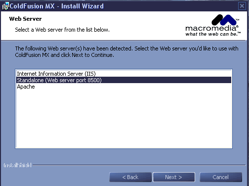 第三步,选择ColdFusion MX所在的Web服务器,可以是IIS,Apache,也可以是Standalone模式,也就是让ColdFusion MX自己作为Web服务器。下图选择了Standalone模式,端口是8500。