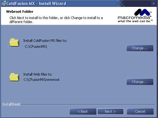 第四步,选择ColdFusion MX文件存放的位置和Web页面所存放的位置,这一步的情况与上一步选择webServer相关。