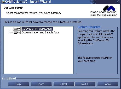 第五步,进行以下安装到硬盘内容的选择,但运行ColdFusion MX环境的文件是必须安装的。