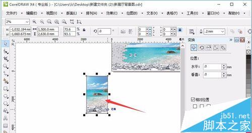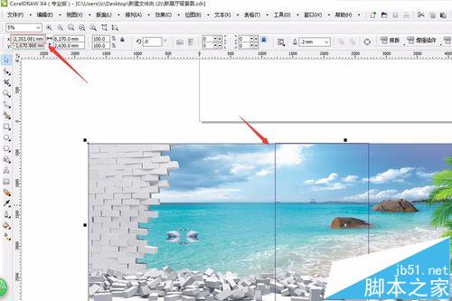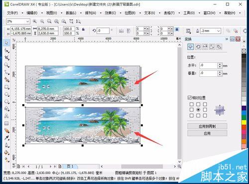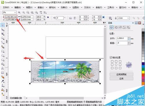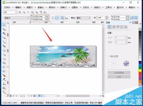 1、CorelDRAW设计好的大尺寸图片画面后,如下图,图片素材的尺寸为8270mmX2630mm,大尺寸如果整张图片完成导出JPG图档的话,文件容量会比较大,同时大尺寸的图片常用的喷绘机写真机无法进行整图完整尺寸进行喷绘打印输出。除非使用大幅宽的喷绘机与大尺寸的纸张喷绘材料才可以进行完整打印。