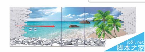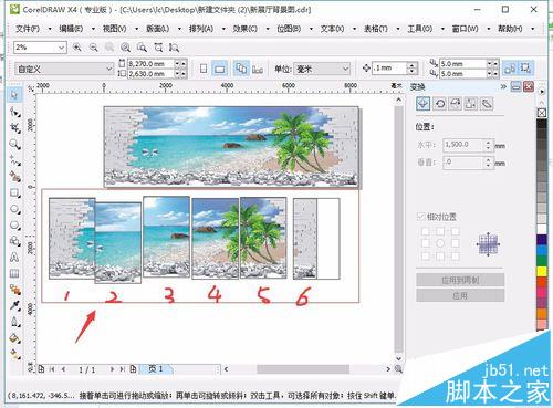 2、上图为壁纸的设计素材,做为壁纸,在喷绘打印后我们需要重新拼接并贴到墙壁上,因此需要对图片素材进行无缝的裁切,分块导出。我们的思路是,使用1.5米宽的壁纸材料进行喷绘打印输出,因此需将8270mmX2630mm图片进行横向裁切,即8270mm除1500mm,约裁剪为5.5张分块小图。如下图,裁切分块后的效果图。