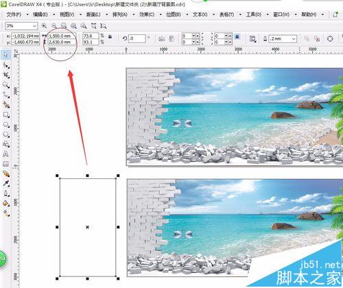 4、选择左边工具栏的“矩形”工具,在工作台是拖出一个矩形,并将矩形的尺寸设置为1500mm宽(即壁纸材料的宽),高2630mm(大图的高度一样,因为壁纸喷绘材料为卷装材料,通常一卷材料的长度为30米或50米,所以,长度我们往往无需考虑)。