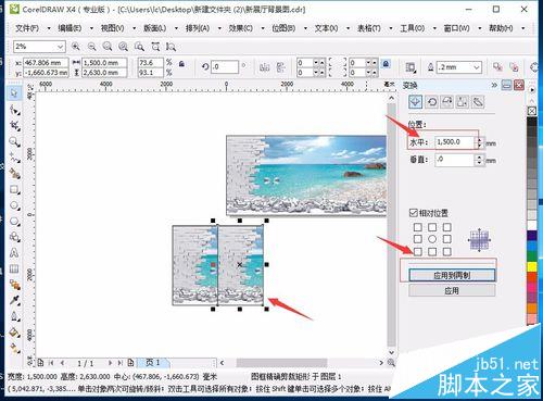 10、点击 工具栏菜单,“排列”--“变换”--“位置”,在位置里输入1500mm,即材料的宽度,点击下面的“应用到再制”。完成复制操作。