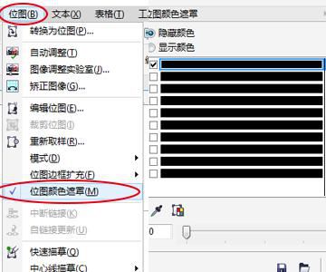 2、单击位图→位图的色彩遮罩命令。在右边会弹出“位图颜色遮罩”的对话框。选择对话框窗口顶部的“隐藏颜色”或“显示颜色”选项。在下面的列表框中有10个颜色框单击第一个颜色框激活它。