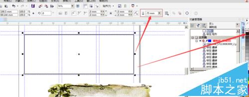 11、画好一个矩形,并导入一张图,选中图像,点击“对象”-->图框精切裁剪-->箭头,选择框,设置边框大小为0.75黑色,按F12,修改文本属性,选择虚线。