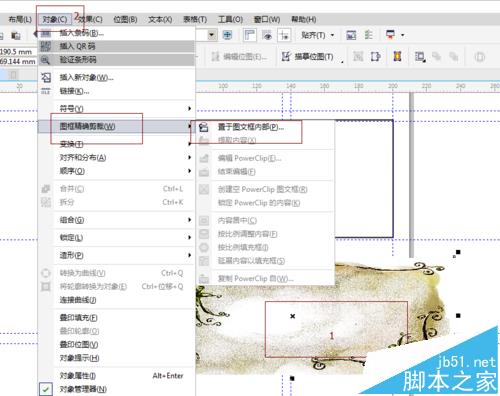 7、选中图像,点击“对象”-->图框精切裁剪-->出来箭头,选择框,如图。