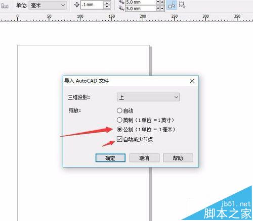 2、打开coreldraw x4软件,将刚刚到出的DXF文件拖动进入,并选择单位为毫米,选择自动添加节点