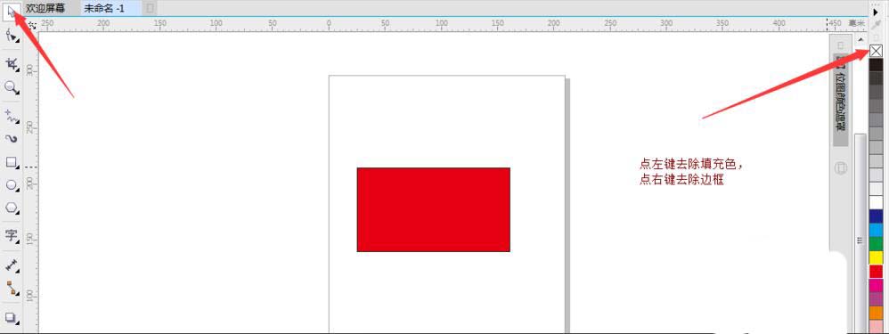 2、选择选择工具,我们看到右边的颜色框框,看到最上面有一个叉叉,这个叉叉,用左键点击是去除填充色,用右键点击是去除边框轮廓色。