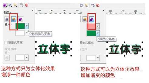 在Coreldraw中立体化类型有6种可以使用,一般字体中常用的效果为左侧最开头的两个,其他类型都不太适合做字体的立体效果。选中之后,可在字体上面进行拖拽,方向可以自由把握,调整的过程中都可以看到效果,所以也不用担心需要反复修改。