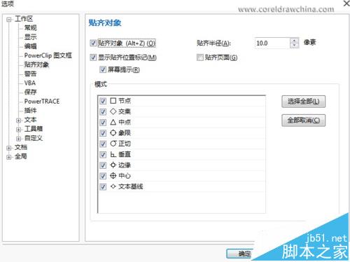 2、如绘图时如果暂时用不到贴齐功能,可以先禁用部分或者全部贴齐模式,以加快CorelDRAW X7的运行速度,如果需要此功能时点击开启即可,操作也是很方便。