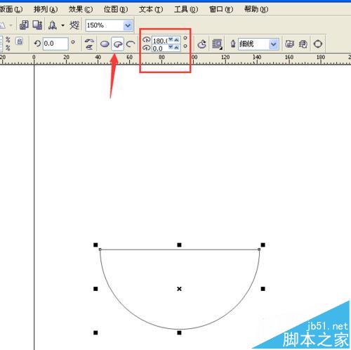 2、选择属性栏的饼形按键,并将饼形的起始角度设置为180度,结束角度设置为0度,这样,就可以得到一个半圆了。