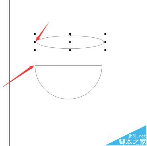 5、选择”挑选工具“,再选择椭圆,把鼠标放在椭圆的左边的位置,直到鼠标显示为四个箭头时,就按着鼠标左键,将椭圆拖到半圆的左上角。将椭圆拖到半圆的左上角位置的时候,半圆的左上角就会像磁铁一样吸住椭圆的。