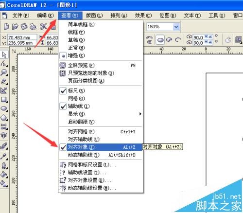 4、选择菜单栏上的“查看”,将“对齐对像”勾选上。