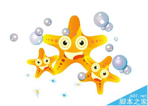 10、复制旋转得到三只海星,使用艺术笔喷雾式添加泡泡和花朵,完成绘制。