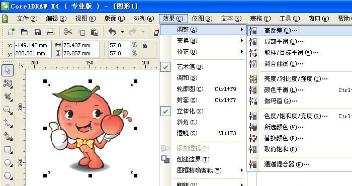 2、接着,鼠标左键单击菜单【效果】>>【调整】>>【高反差】,如下图所示。给素材图片添加一个高反差效果。