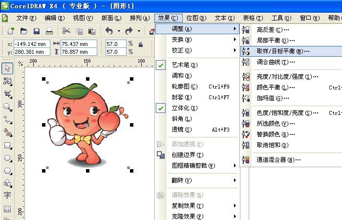 6、接着,鼠标左键单击菜单【效果】>>【调整】>>【取样目标平衡】,如下图所示。给素材图片添加一个取样目标平衡效果。