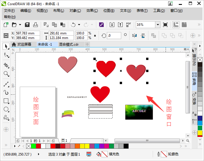 1. 在CDR绘图窗口,利用“选择工具”选中需要导出的对象,如图所示已选择两个心形。如果不选中的话,CorelDRAW软件会把有页面中的所有对象都导出来。