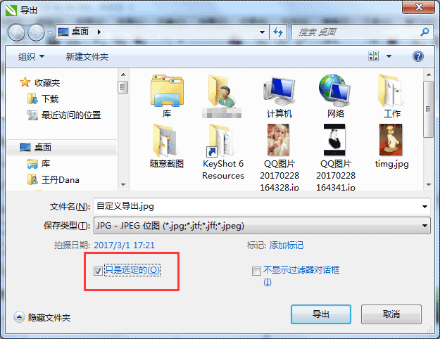 2. 点击“文件”在下拉菜单中选择“导出”命令,在弹出的对话框中定义文件保存位置、输入文件名并选择保存类型为JPG格式。接着很重要的一步,在页面左下角将“只是选定的”选项勾选,然后单击“导出”按钮。