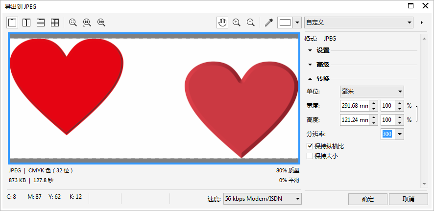 3. 在弹出的“导出到JPEG”对话框中可以清楚的看到被预览的对象就是在第一步时被选中要导出的对象。根据需要设置导出图片的颜色模式、图片质量、大小和分辨率等。