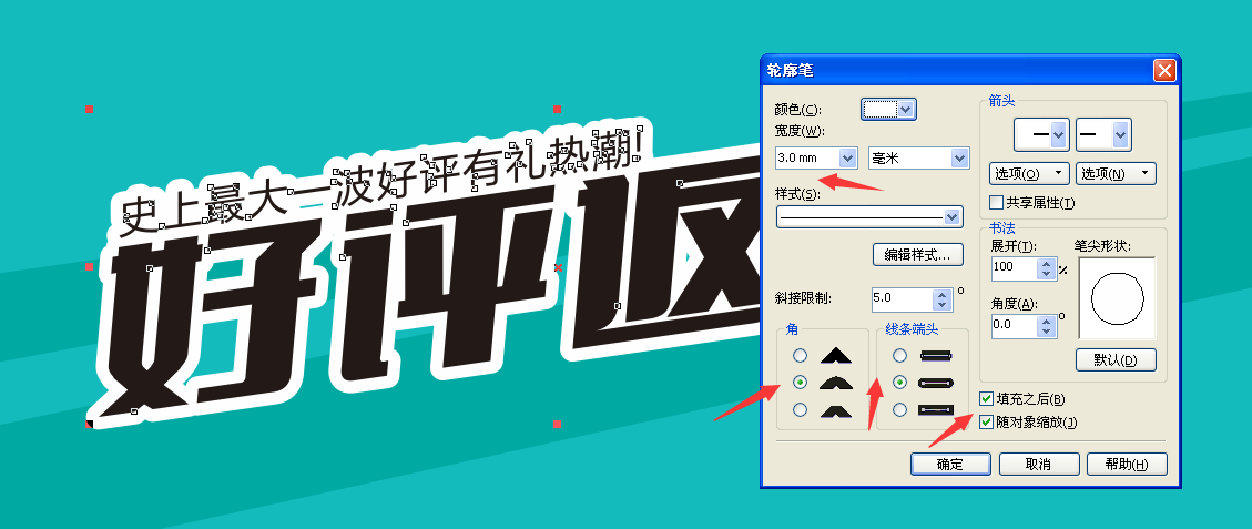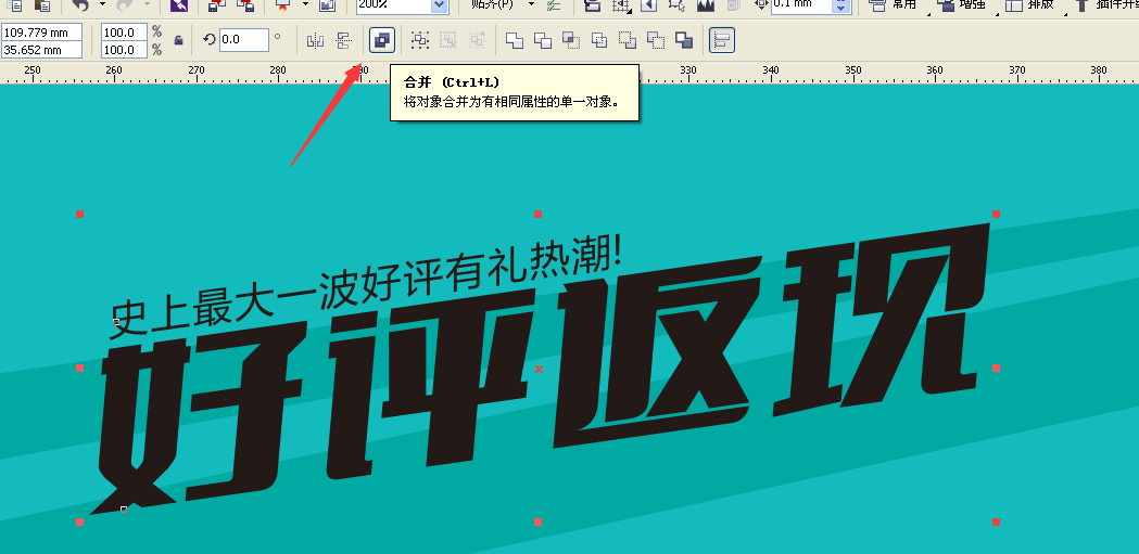 4、把字复制一份放到一边,把原来两排字转曲全部选中点击合并,按F12调出轮廓笔,设置参数如图