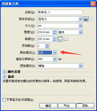1、打开CDR软件新建一个文档,颜色模式选GRB,点击确定