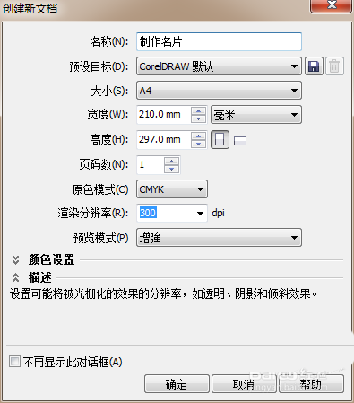 1、新建一个A4纸大小的新建文件,参数如图