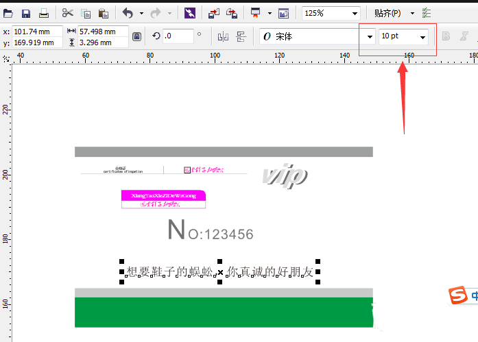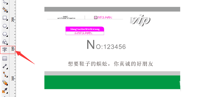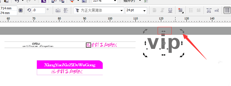 10、在旁边打一个VIP,用挑选工具选中,连按两下,这时候交上的箭头是用来旋转用的,上方的箭头是用来变形用的,我们用上面那个。我们再复制一个VIP,填充白色。再复制一个,然后填别的色。按加号复制哦。如图。