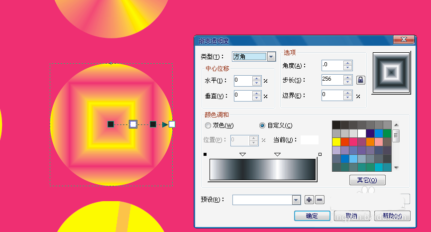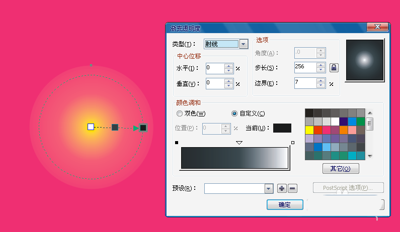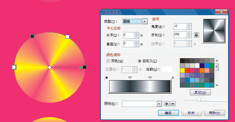 画一个圆形,拉上射线透明,中间是黑色的就透明了,点击属性栏上面第一个图标打开渐变透明度对话框,把黑色和白色调整方向就做出了四周透明的效果,大家可以任意拉出自己想要的效果。