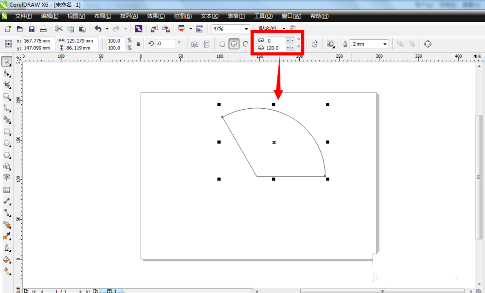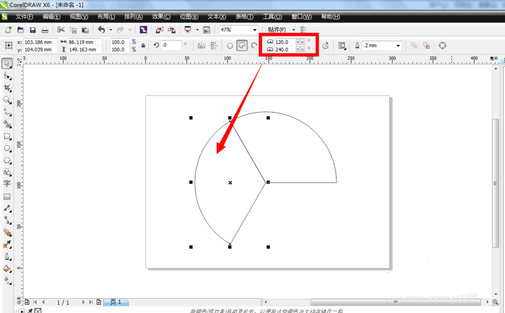 4、一个圆为360°,那么三等分的,也就是一个圆的三分之一,有120°。设置起始角度0°,结束角度120°,再按下键盘上的enter键,即可以得到三分之一的圆