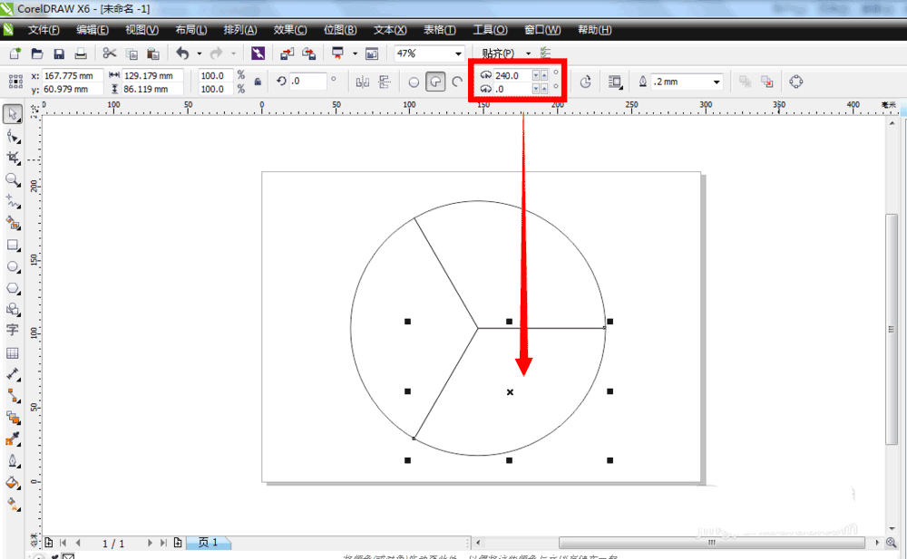 7、再把鼠标在页面的空白位置单击一下,就可以得到一个完整的三等分的圆了。其他的几等分,只要计算好每部分的角度数值,按照这个办法,设置相应的起始角度和结束角度即可。