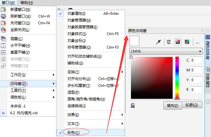 方法二 执行“窗口”>“泊坞窗”>“对象属性”命令,打开“对象属性”泊坞窗,单击“填充”选项,即可选择需要的颜色模式CMYK,并选择颜色或手动自定义颜色,将颜色填充到对象上去。