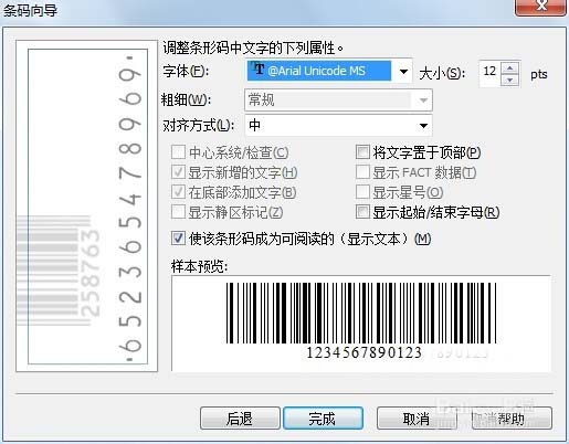 7、再单击下一步,设置条形码的字体,然后点击完成。