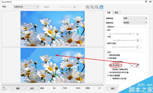 步骤3:弹出的“PowerTRACE”对话框,调整“跟踪控件”各参数值,注意要勾选“移除背景”选项中的“指定颜色”,然后激活取色吸管。