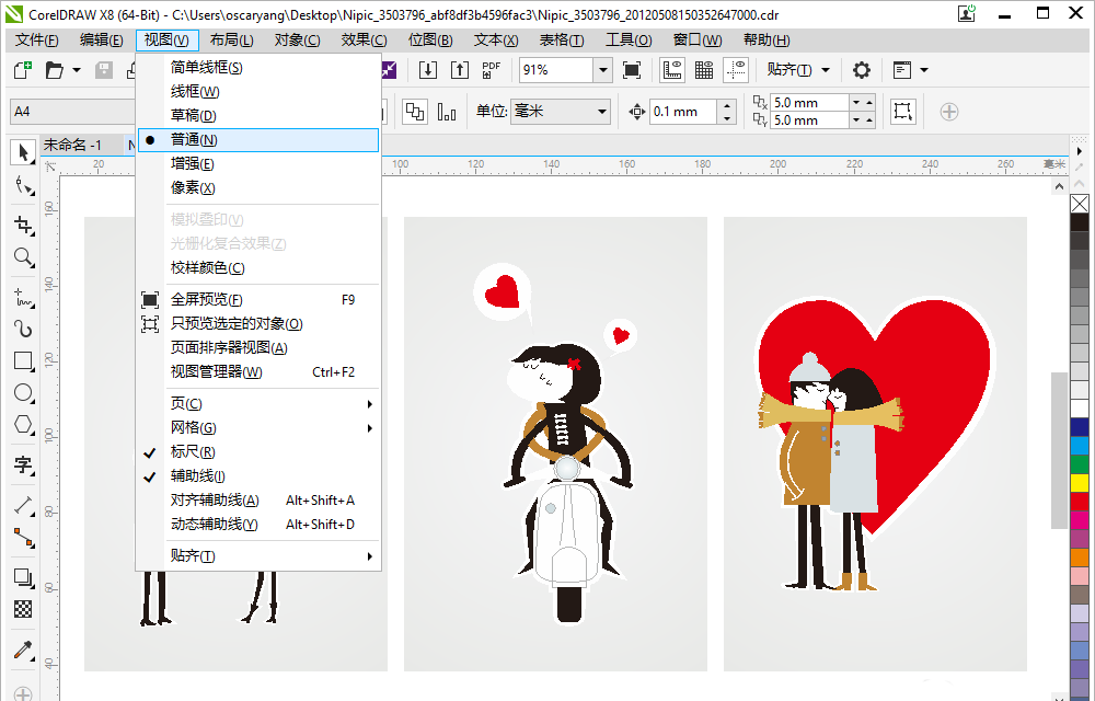 5、我们也可以切换为普通模式,如果CDR文件过大会比较卡,为了流畅运行,可以考虑使用普通模式,保留了颜色。