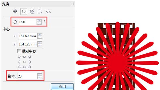 7、旋转并复制图形。执行“窗口”→“泊坞窗”→“变换”命令,在打开的“旋转”泊坞窗中,设置具体参数,设置旋转角度为15度,在“副本”文本框中添加复制个数,得到的效果如图所示。