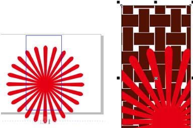 8、精确裁剪。将旋转后的所有图形进行群组,执行“对象”→“图框精确剪裁”→“置于文本框内”命令,当光标变为黑色的大箭头时,单击矩形,得到的效果如图所示。
