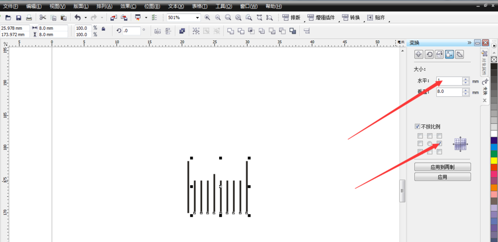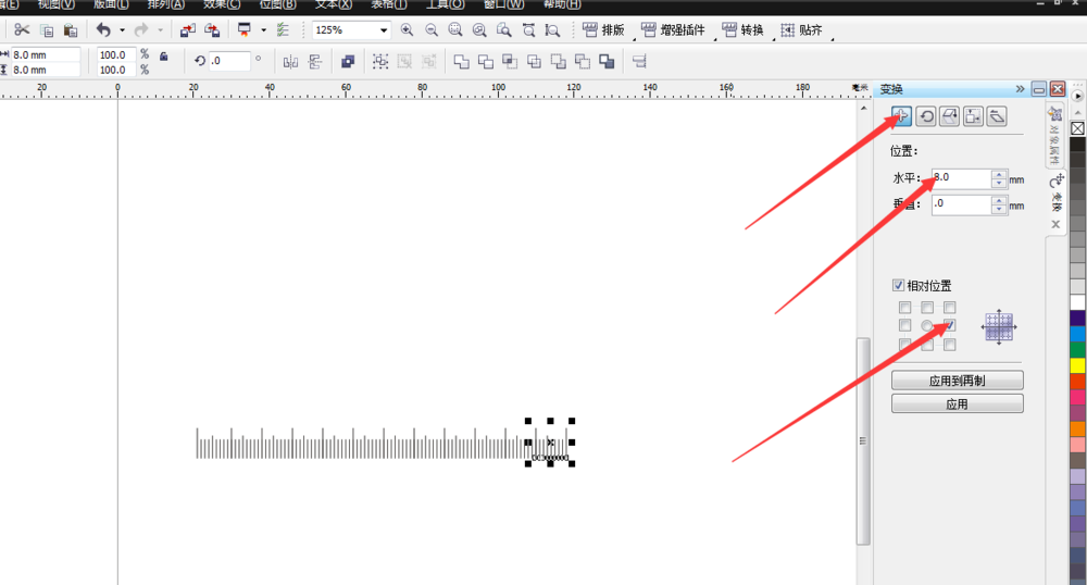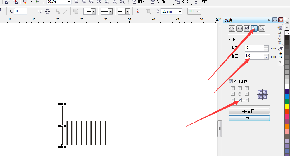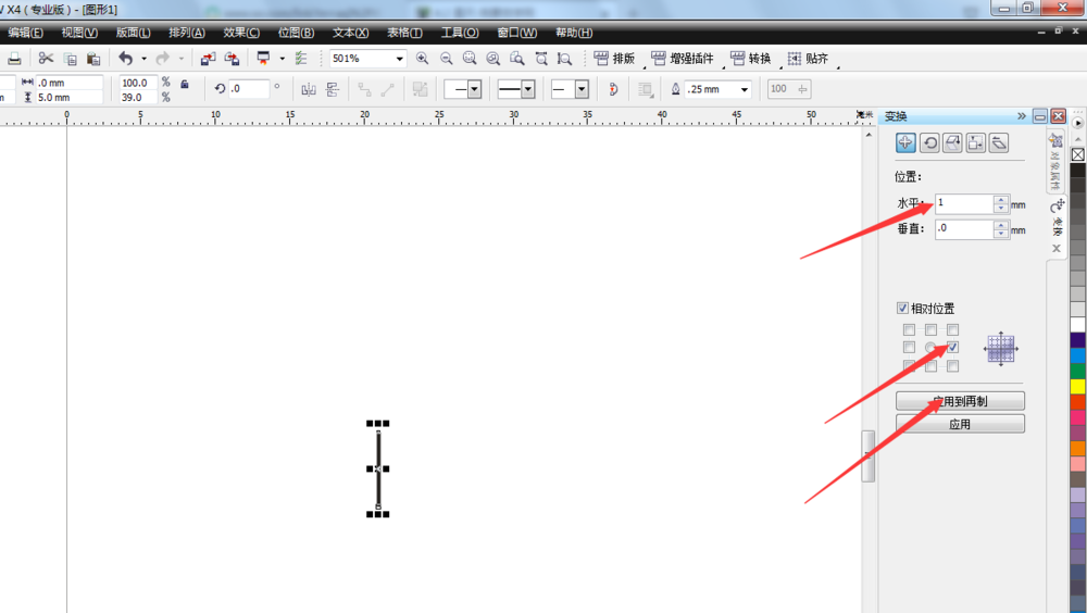 3、选中画好的线,选择应用再制功能,水平设置1mm,在右边中间框打钩,单击再制。