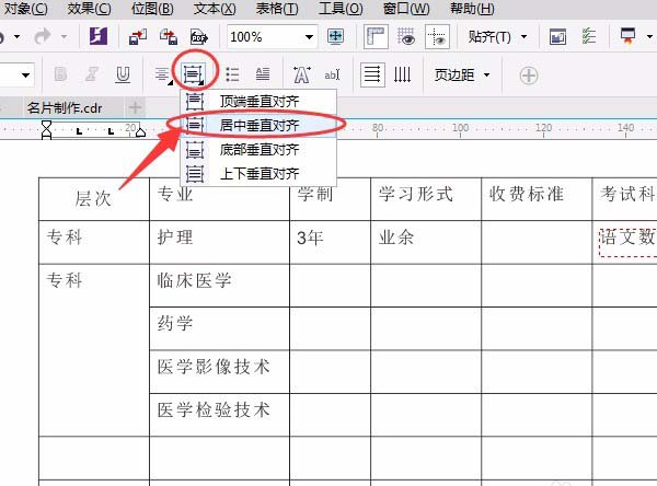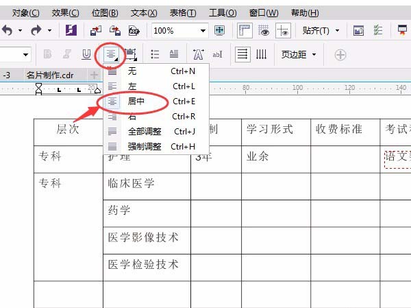 7、单元格文字居中,光标放入单元格后单击属性栏中的“文本居中”和“垂直居中”中的“居中”,只能一个一个单元格居中。