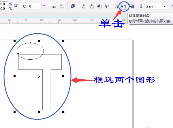 4、按空格键切换成“选择工具”框选两个图形,单击属性栏中“移除前面对象”,如图所示: